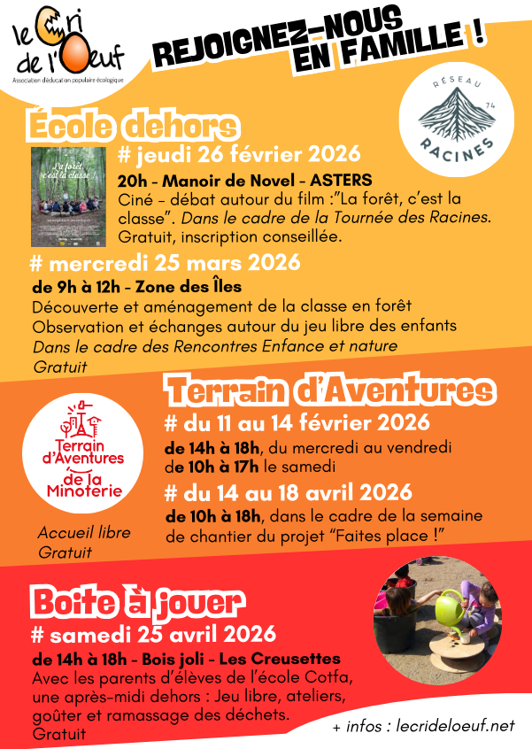 • une matinée parents enfants dans la forêt pour découvrir l’intérêt du jeu libre, mercredi 25 mars 2026 de 9h à 12h.