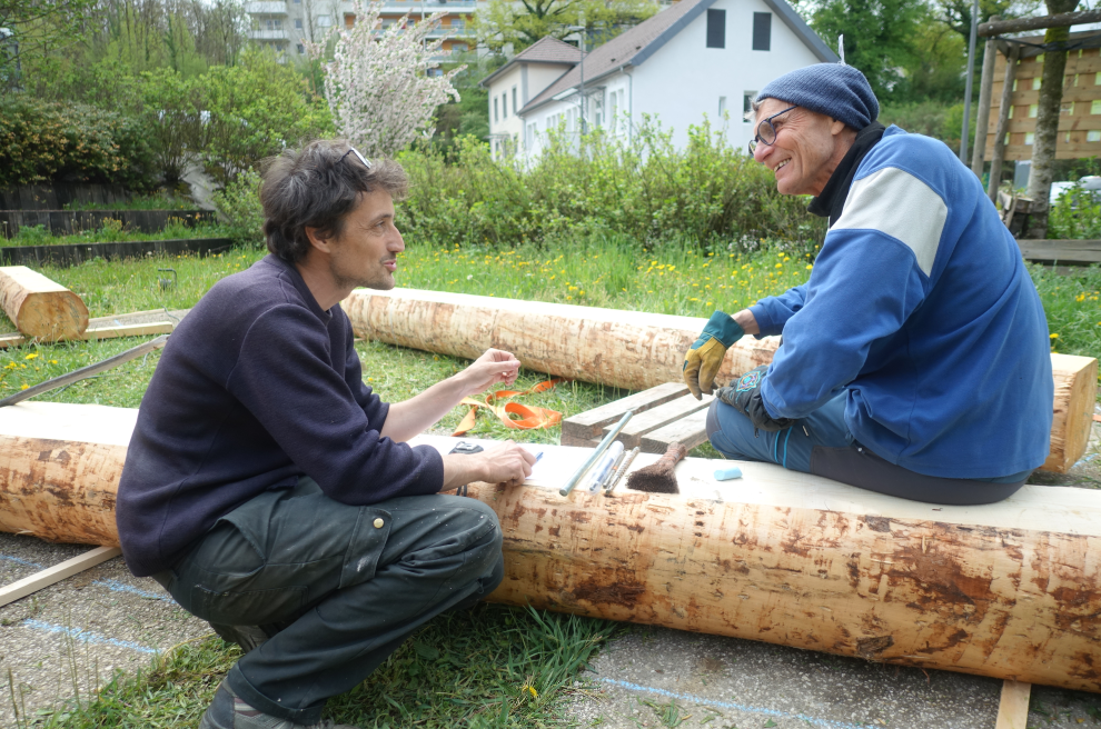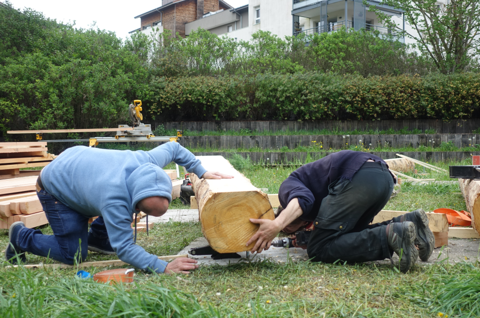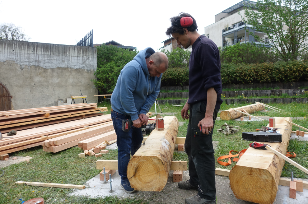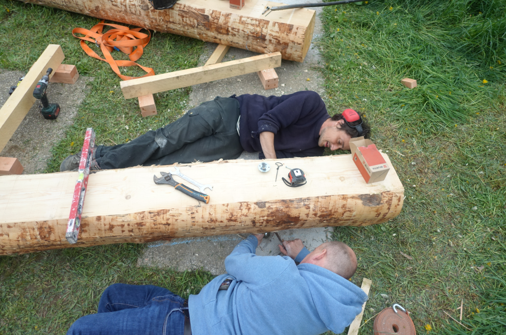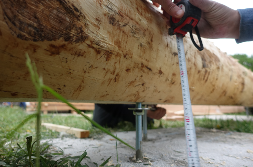 Après le scellement des tiges filetées, il ne reste plus qu’à positionner les grumes dessus. Mission un peu technique mais assurée haut la main par Ben et François ! Au millimètre !
