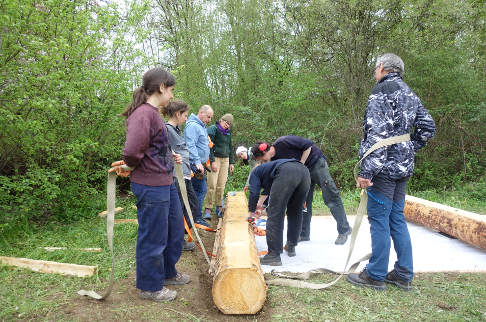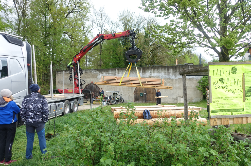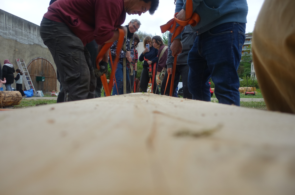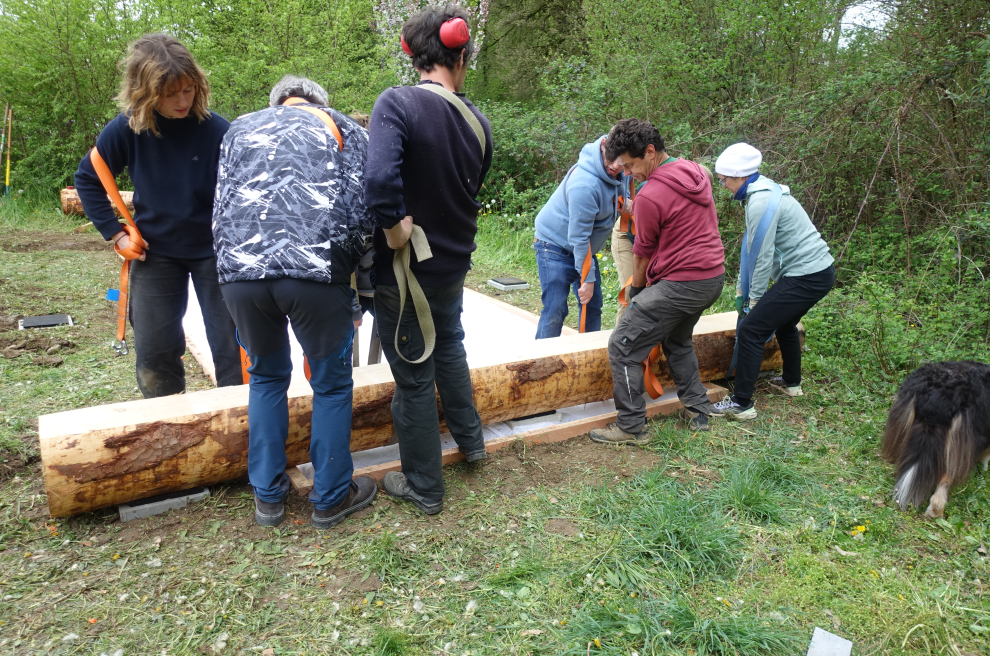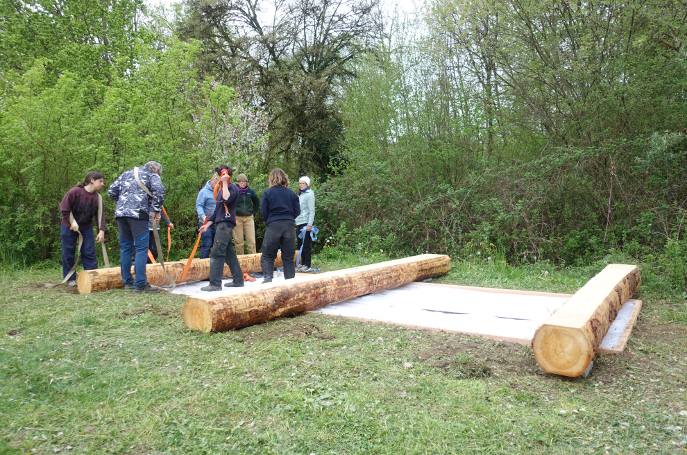 Pour terminer cette première journée de chantier, il nous fallait poser les trois grumes qui serviront de base à la structure du radeau, grand table de 5 mètres de long qui permettra de faire vivre cette Agora. Ho hisse, Ho hisse !