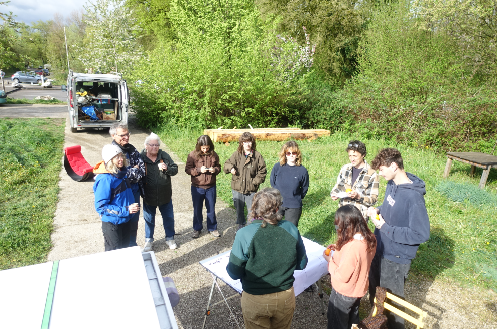 Réunion de chantier et présentation des projets des étudiantes de l’ESAAA : Flavie, Zoé et Jeanne qui proposeront tout au long de la semaine des projets artistique autour du radeau et du Terrain d’Aventures.